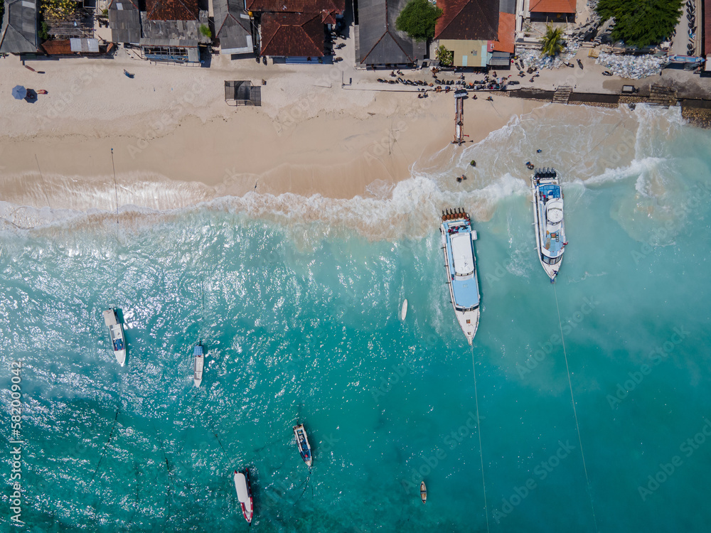 Aerial shoreline view of Jungutbatu beach at Nusa Lembongan with tourist speedboat anchored. One of travel destinations close to Bali island, Indonesia.