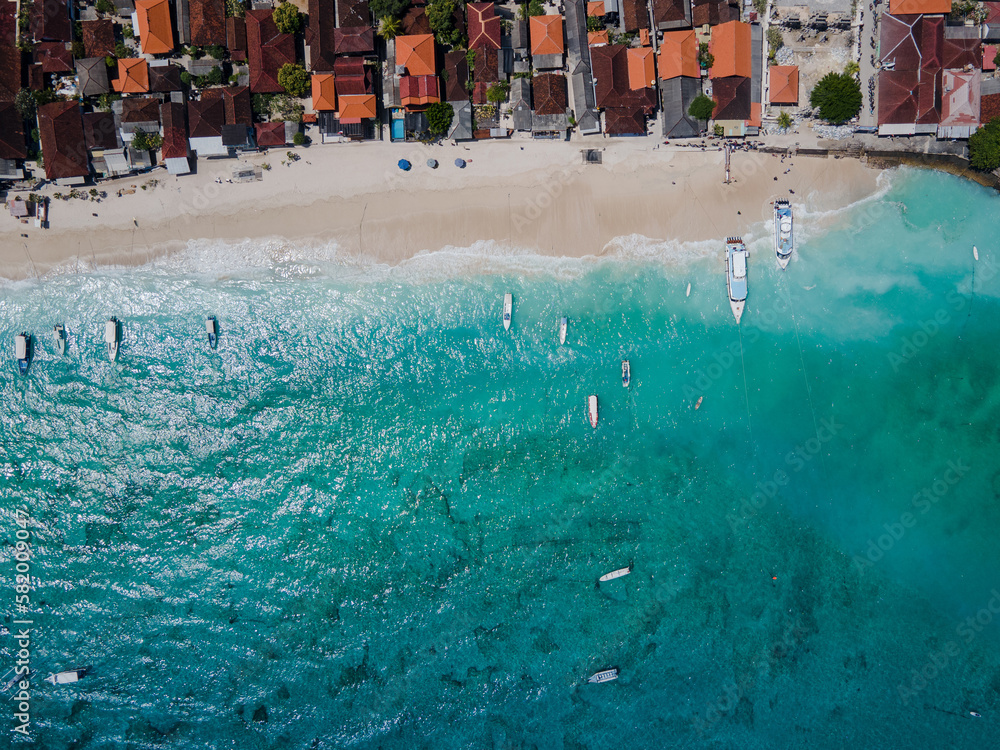 Aerial shoreline view of Jungutbatu beach at Nusa Lembongan with tourist speedboat anchored. One of travel destinations close to Bali island, Indonesia.