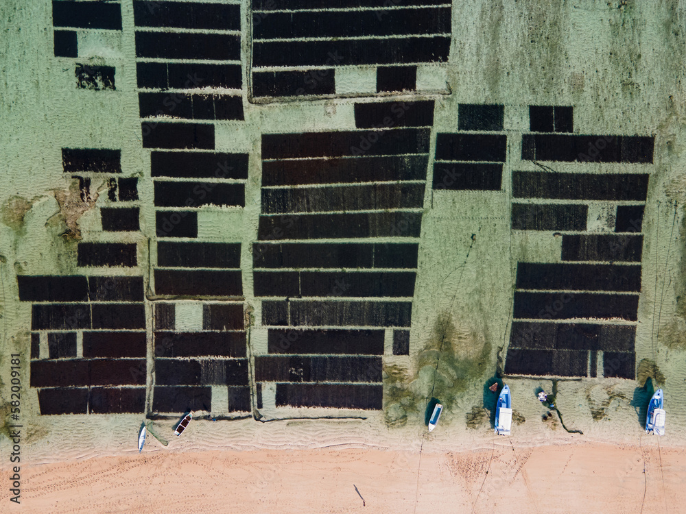 Aerial view of seaweed farm with rural boats anchored on shoreline, Agriculture field on the sea in Nusa Lembongan close to Bali, Indonesia.