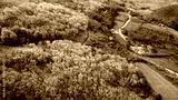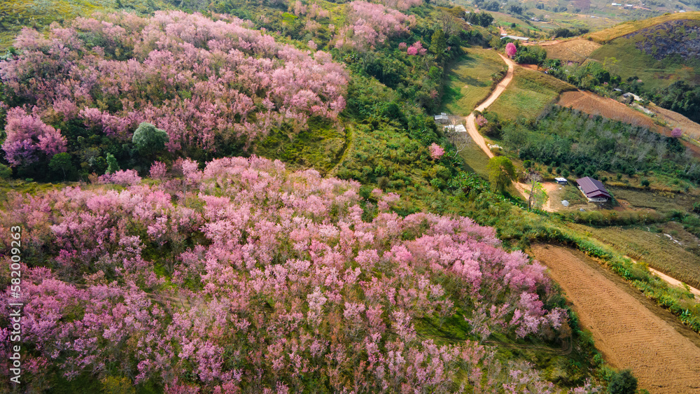 Aerial view of pink cherry blossom on the hill or Wild Himalayan Cherry flower field on Phu Lom Lo mountain during January or February in area of Phitsanulok and Loei Province, Thailand.