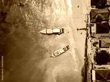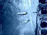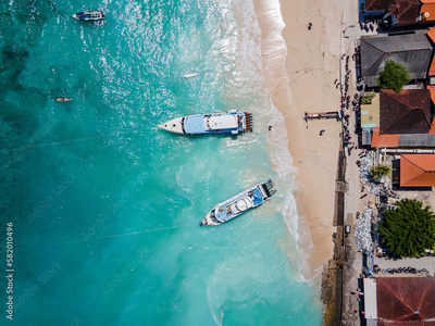 Aerial shoreline view of Jungutbatu beach at Nusa Lembongan with tourist speedboat anchored. One of travel destinations close to Bali island, Indonesia.