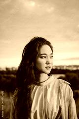 日の出の光と女性