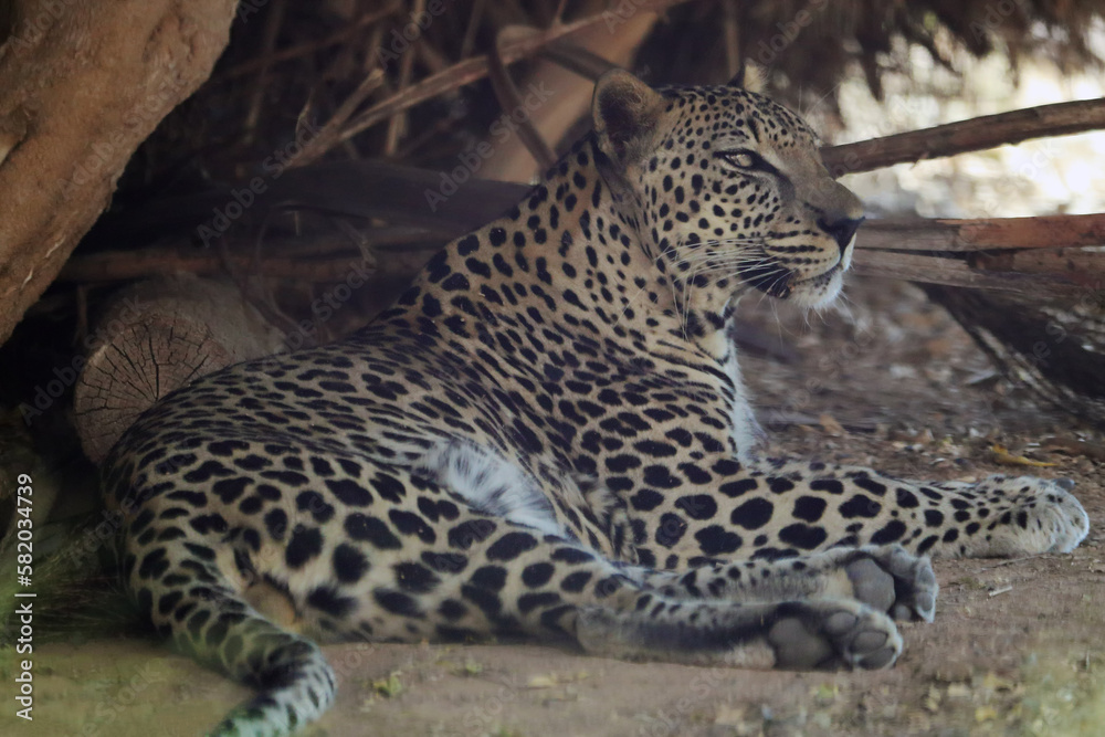 The Arabian leopard (Panthera pardus nimr), an adult male of this small subspecies lying under a bush in the shade.