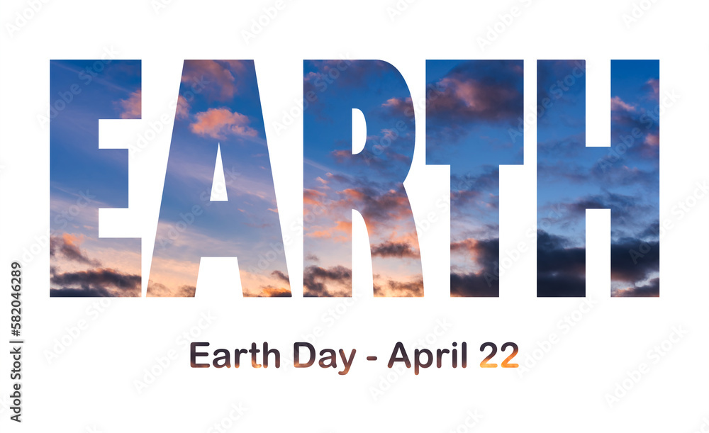 Lettering Earth Day April 22 on the background of sunset sky. Earth day concept, protection of the planet from pollution, improvement of environmental ecology and nature conservation.