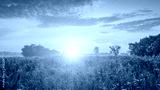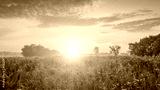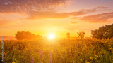 Sunrise on a field covered with wild flowers in summer season with fog and trees with a cloudy sky.