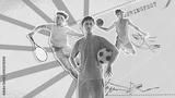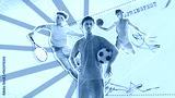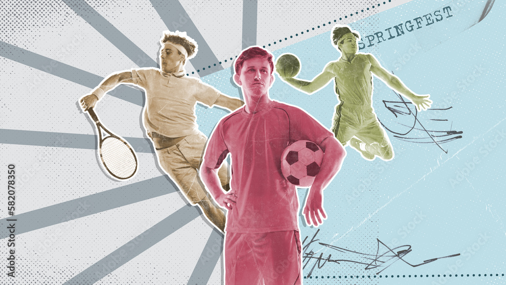 Retro style poster with portrait of athletes, football, tennis and basketball players. Contemporary art collage. Sport, goals, professional occupation concept