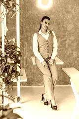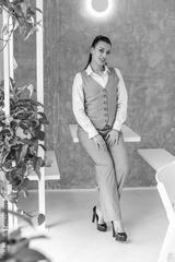 Portrait of elegant business lady wearing gray formal suit standing in modern office. Work concept.