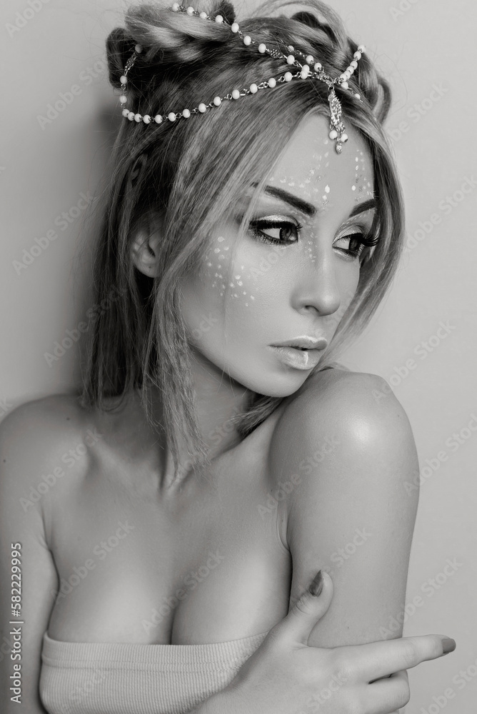 Young attractive cute girl with an unusual creative make-up of wild deer. Halloween ideas of beauty photography