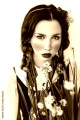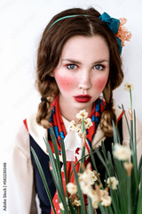 Fashionable beautiful brunette girl in a dress with floral embroidery with color makeup: red cheeks and lips posing with a flower. Granny chic style. Retouched portrait