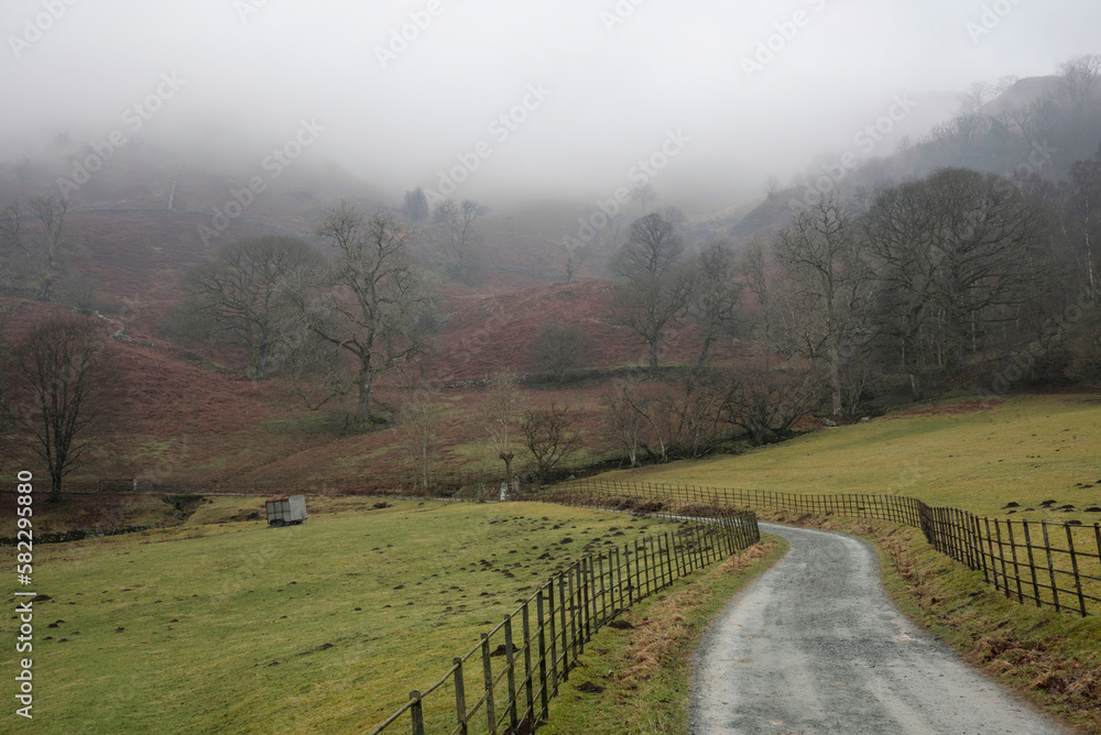 Beautiful peaceful Winter landscape image of road around Loughtrigg Tarn on misty morning with calm water and foggy countryside in the background