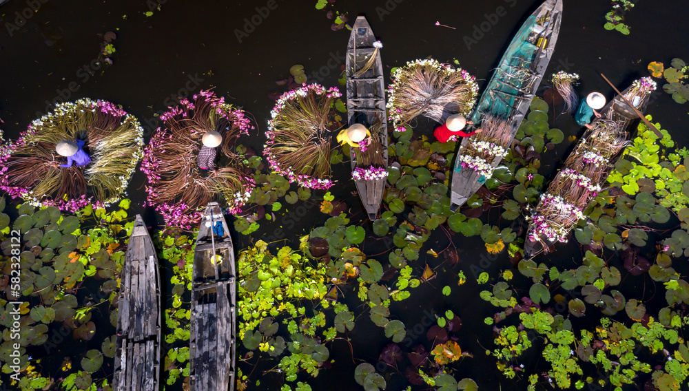 Rural women in Moc Hoa district, Long An province, Vietnam are harvesting water lilies. Water lily is a traditional dish here