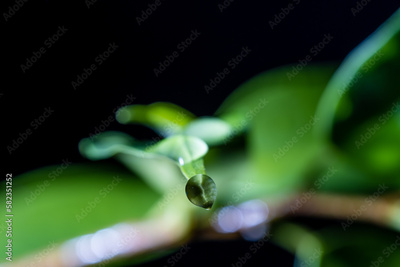 Water drops on the green stem of the plant close-up.