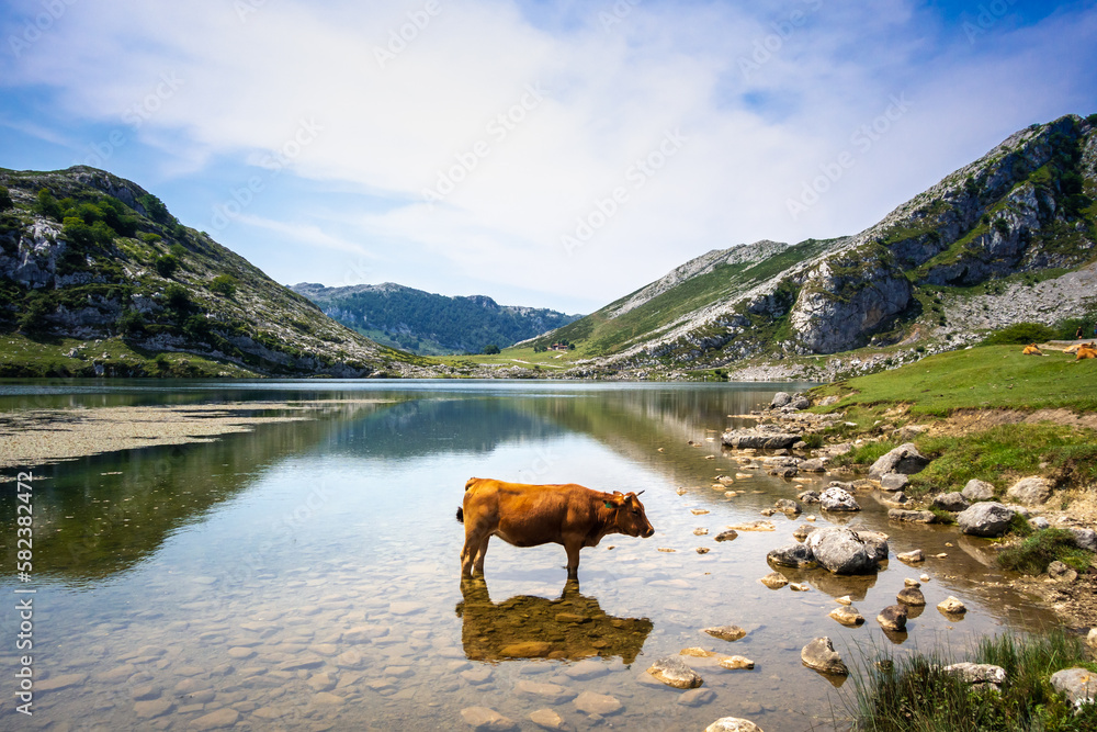 Cows around lake Enol in Picos de Europa, Asturias, Spain