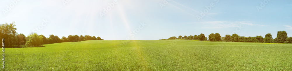 Wiese mit frischem Gras im Frühling und Sonne am Himmel - Panorama