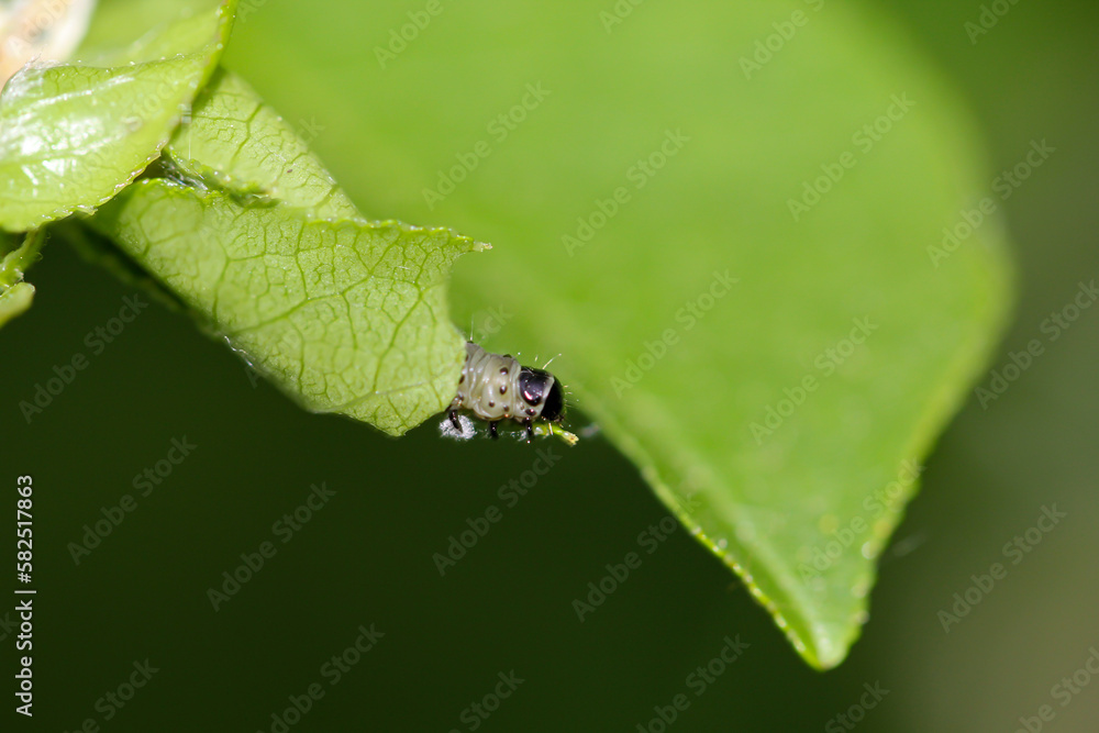 Eine Raupe hat sich in einem Blatt eingewickelt.