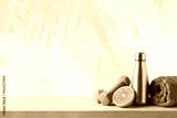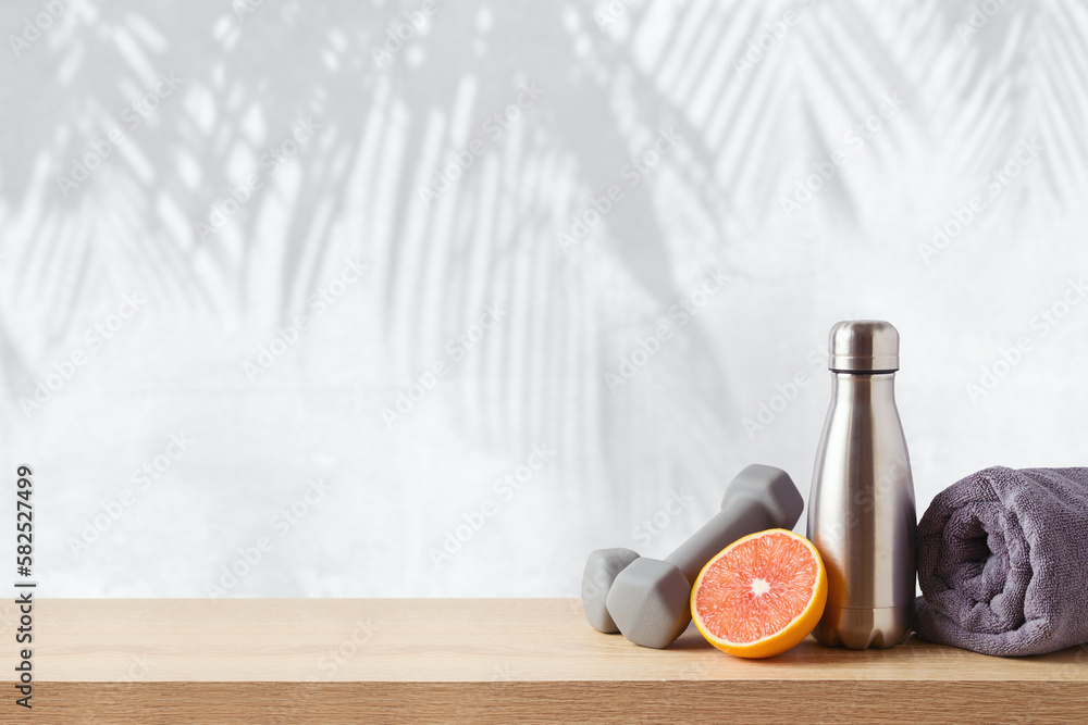 Summer fitness background with bottle of water, orange and dumbbells on wooden table over wall with palm tree shadows