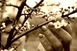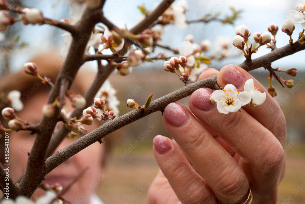 Cherry plum blossoms. Beautiful woman's nails with beautiful baby boomer manicure. Beautiful woman hand holding a blossoms branch in the garden. Spring manicure on short nails. Easter season
