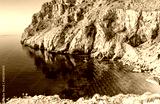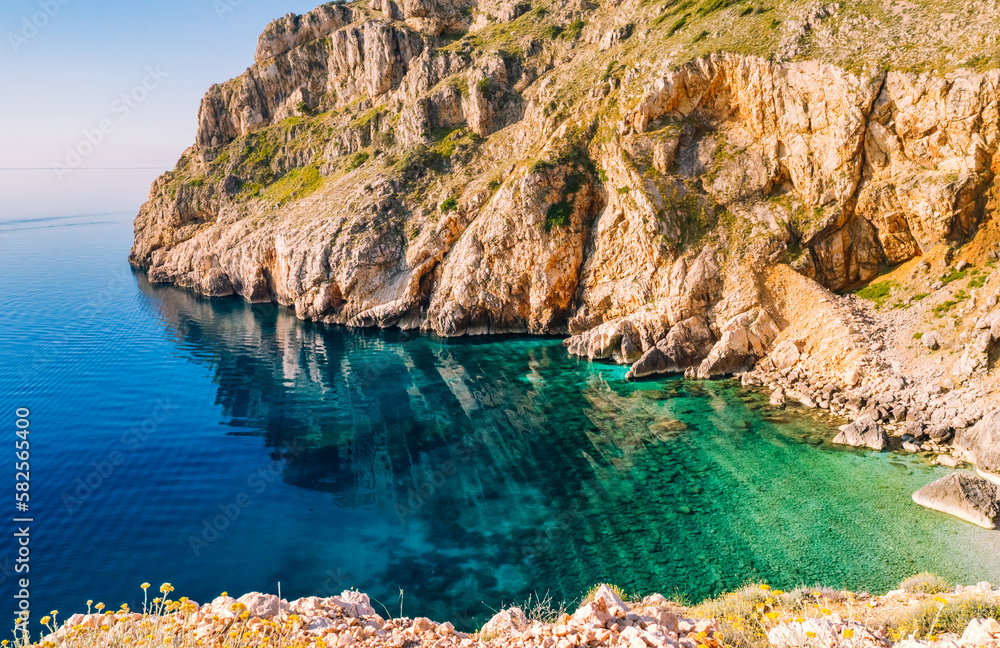 Calm lagoon and wild beach with azure water on a sunny day. Island Cres, Croatian coast, Europe.