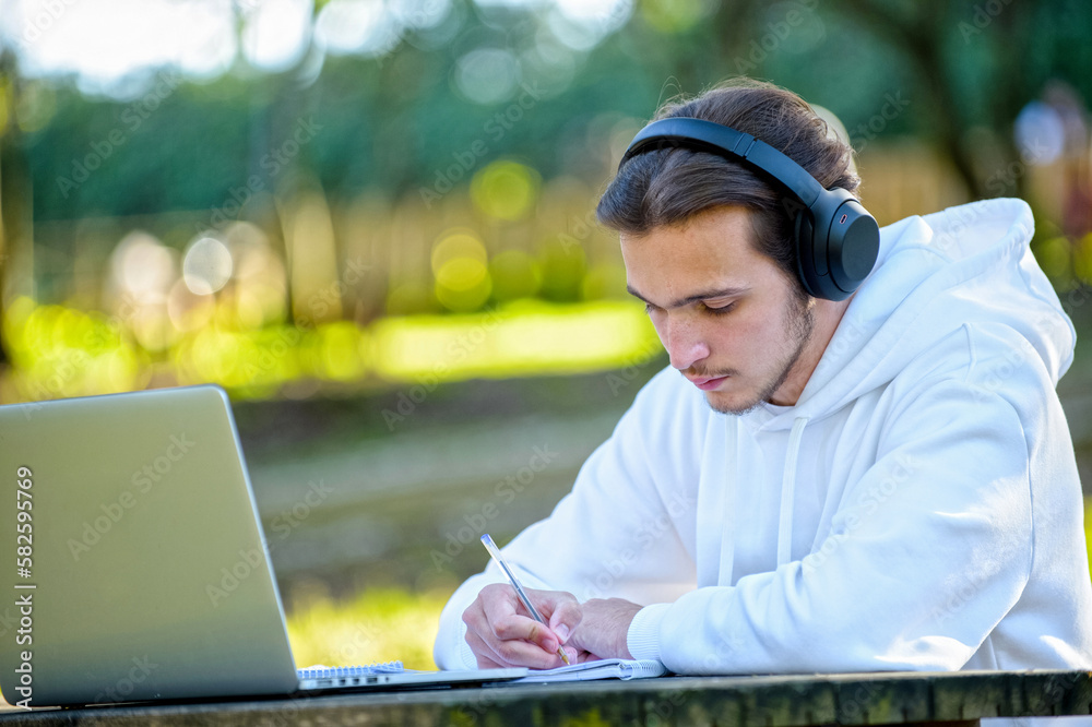 Young man writes with a pen in a notebook at a table in the park. Student studies in nature. Young guy is studying outdoors sitting in the park.