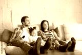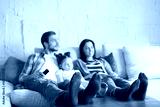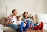 Happy family with child sitting on sofa watching tv, young parents embracing daughter relaxing on couch together.