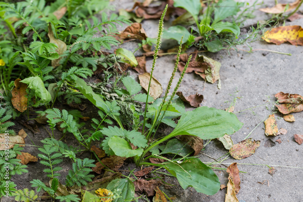 Broadleaf plantain bush and other plants growing in concrete cracks