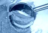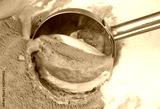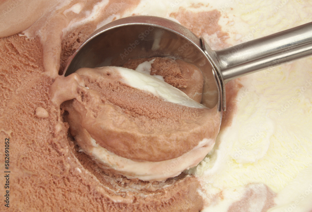 Close up of metal scoop with chocolate and vanilla ice-cream.