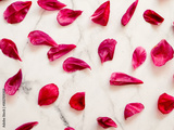 Flat lay pattern with red petails, white marble