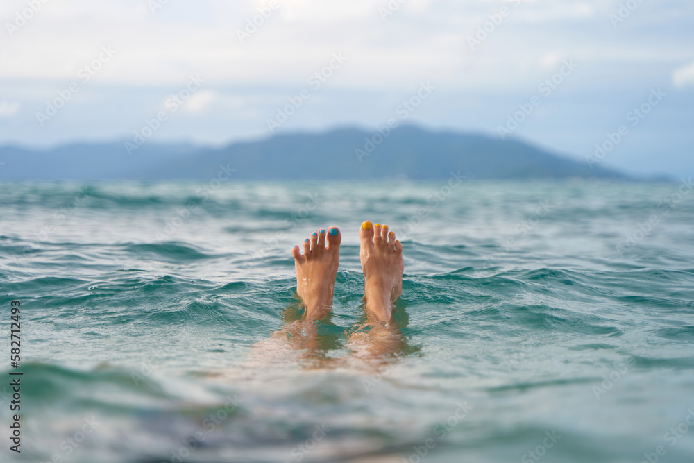 A girl with a yellow and blue pedicure relaxes in the sea overlooking the island