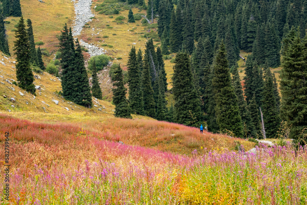 The beginning of autumn in the mountains near the city of Almaty. Glade terra in the mountains