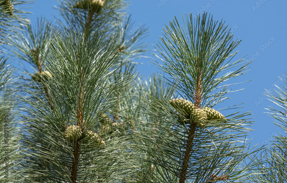 Green pine cones on a tree branch in the forest.