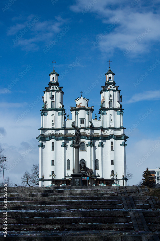19.03.2023 Białystok Polska. Piękny biały kościół katolicki na wzgórzu.