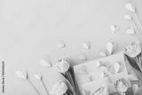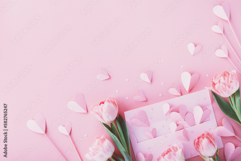 Envelope with spring tulip flowers and paper hearts on pink background for Mothers day greeting message.