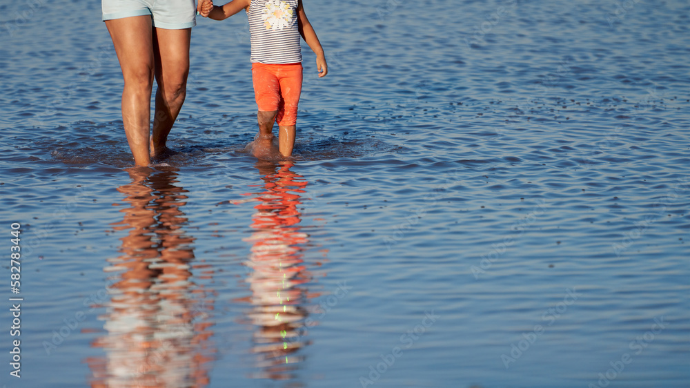 A woman and her child wade across a flooded pond. Their silhouettes are reflected in the water. Copy space.