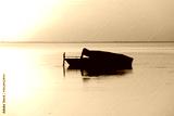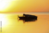 Silhouette of a motor vessel on calm baltic sea during golden sunset. Boat tied to a pole, close to the beach of Greifswald, Germany