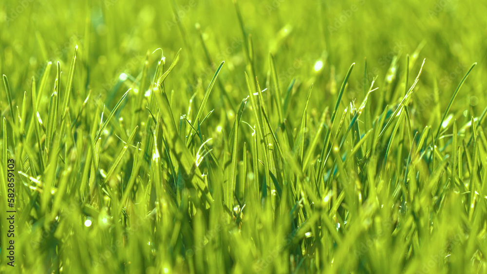 DOF, CLOSE UP: Shiny raindrops on lushly growing garden grass on a sunny day