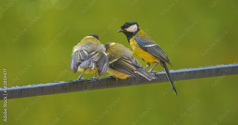 CLOSE UP, DOF: Rear view of great tit mother bird feeding her brood on fence