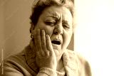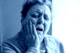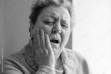 Aching Teeth Senior Woman in Pain at Home. A senior woman experiences a toothache while sitting at home, with a sad expression on her face.