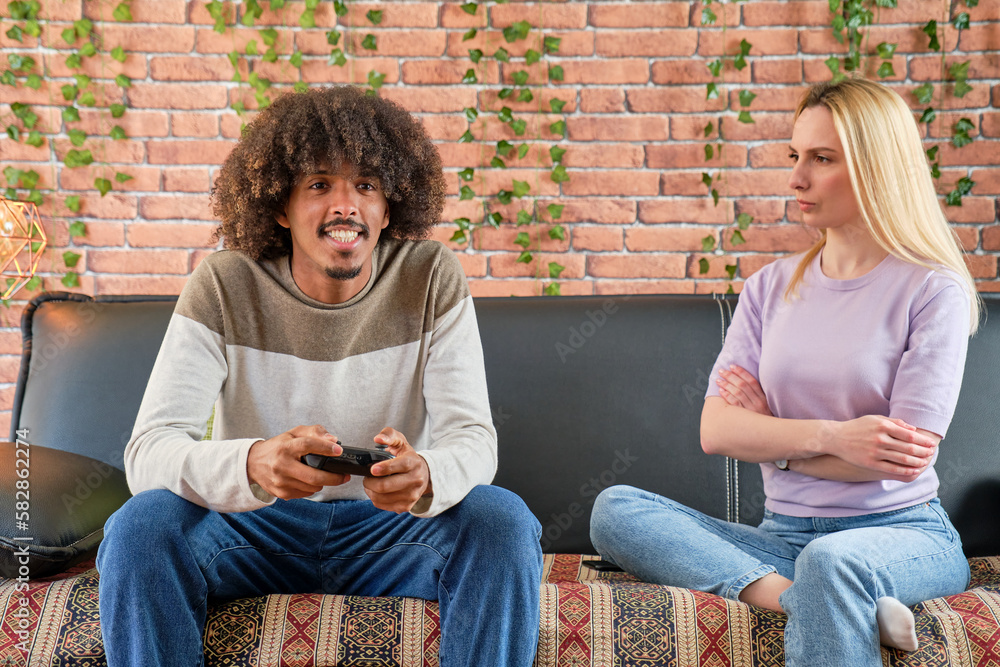young african american guy playing video game and his blonde caucasian girlfriend next to him looking at him with angry face