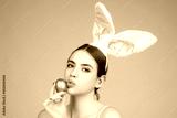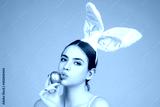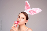 Easter woman. Cheerful young girl celebrating easter isolated over studio background. Studio photo of a young woman wearing bunny ears. Festive bunny.