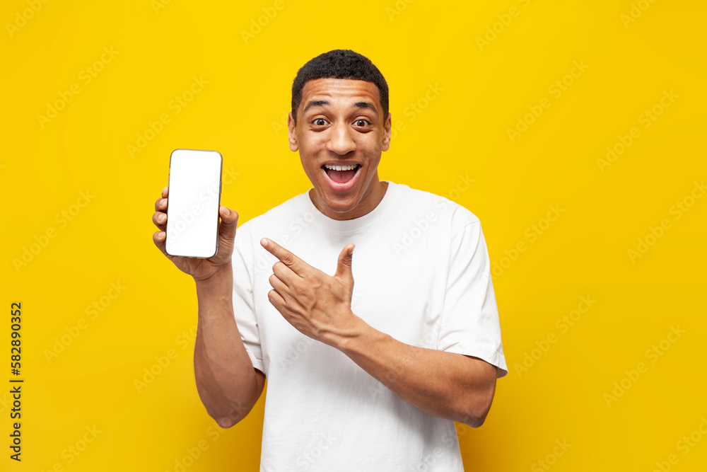 young african american guy in white t-shirt shows blank screen of smartphone on yellow isolated background