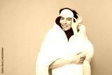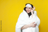 cute young girl in sleep mask and with warm soft comfortable blanket stands on yellow background