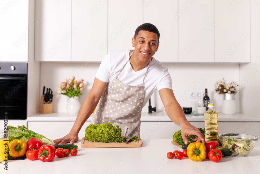young african american man in apron prepares vegetarian salad with vegetables and greens in white modern kitchen