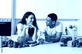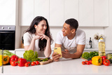 young multiracial couple preparing veggie salad of vegetables and herbs and using smartphone