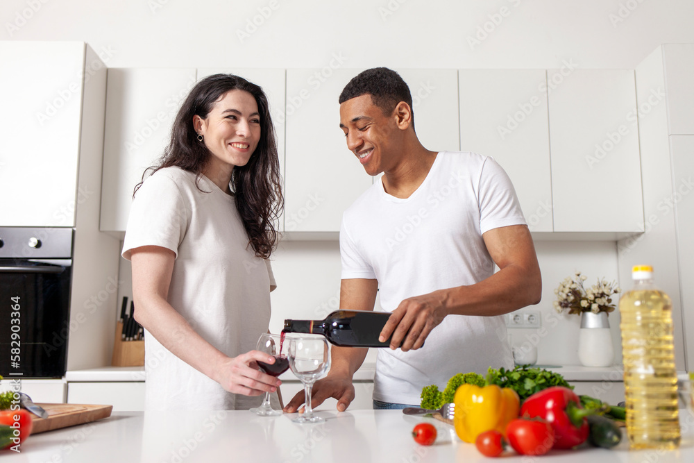 young happy multiracial couple drinking wine in white modern kitchen, african american guy pouring red wine