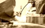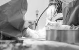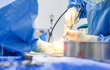 Doctor or surgeon in blue uniform inside operating room in hospital did orthopedic surgery.Surgeon use saw blade to cut the bone in Diabetic foot ulcer patient.Osteotomy was done with light effect.
