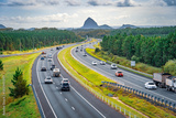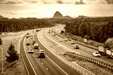 Queensland, Australia - Cars moving along Bruce Hwy with Glass House mountains in the background