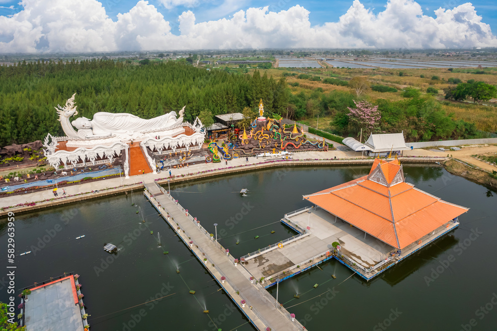 Drone view of A large white Buddha statue reclining on a serpent pedestal with the 9 Serpent clan statue around the mountain at Wat Don Khanak, Nakhon Pathom, Thailand