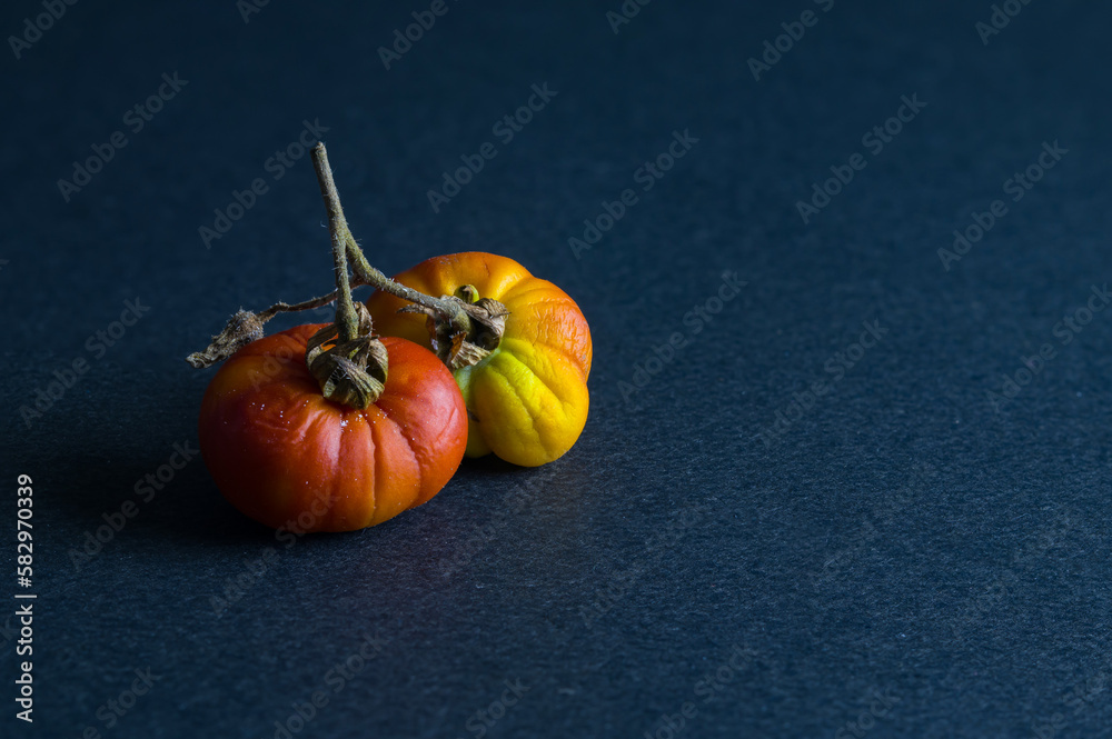 two ripe tomatoes of red and yellow color shot against black background. tomatoes are rich in beta carotine and other vitamins.