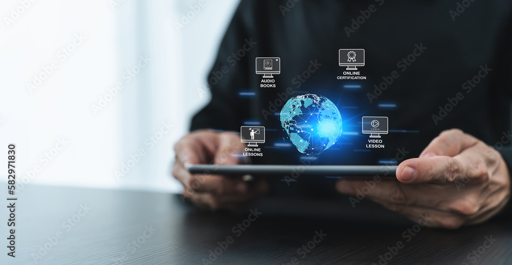 Businessperson or university student using tablet for online education learning or knowledge studying via internet at home. Distance learning and training course or class or e-learning via cyberspace