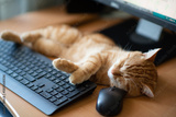 Cute ginger tabby cat well-fed and satisfied sleeps at home working place next to keyboard, PC mouse and monitor screen.